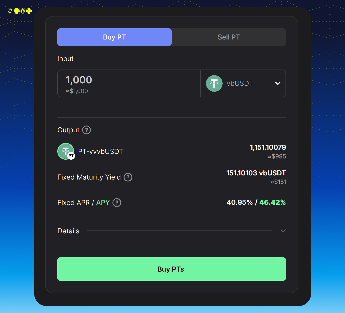 fixed yield products: PTs create certainty for users who want to secure predictable returns on assets like yvvbTokens without exposure to fluctuating APYs.