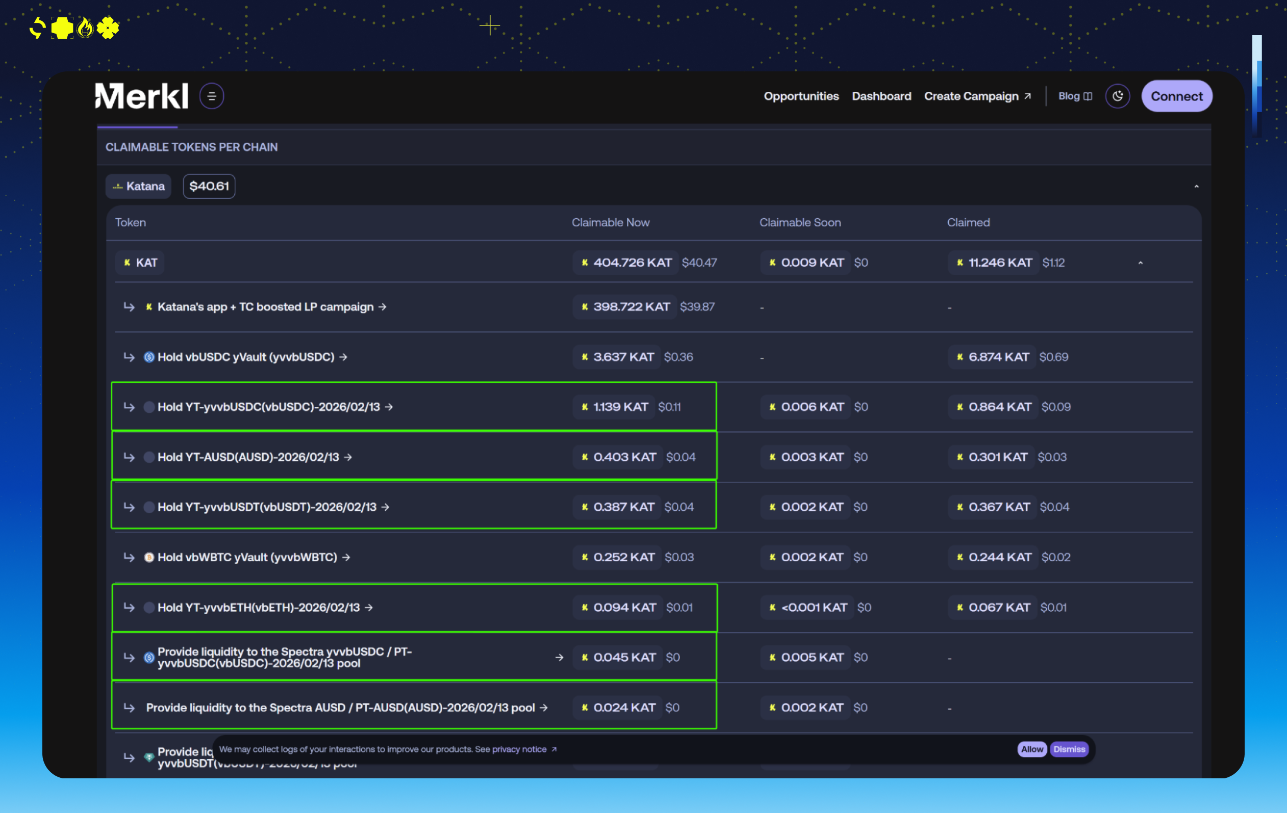 katana KAT rewards (trackable via merkl)